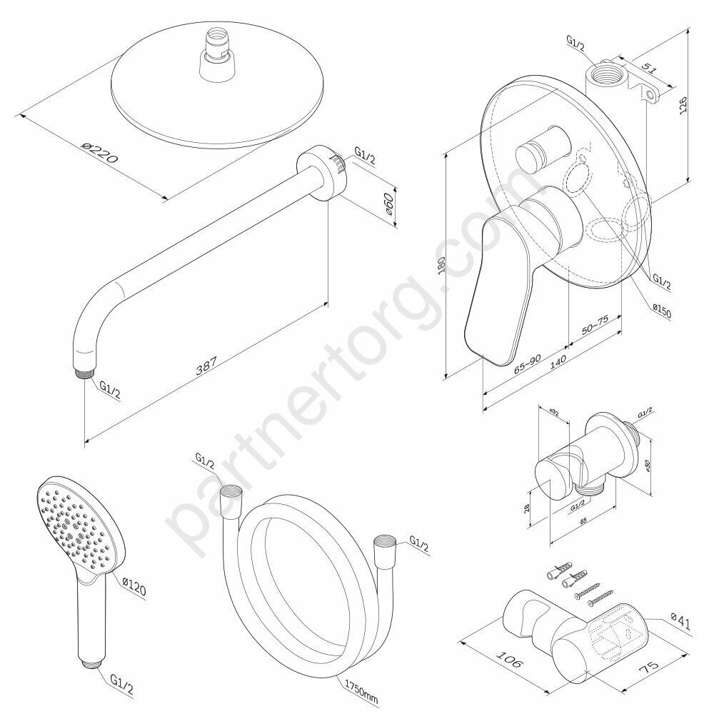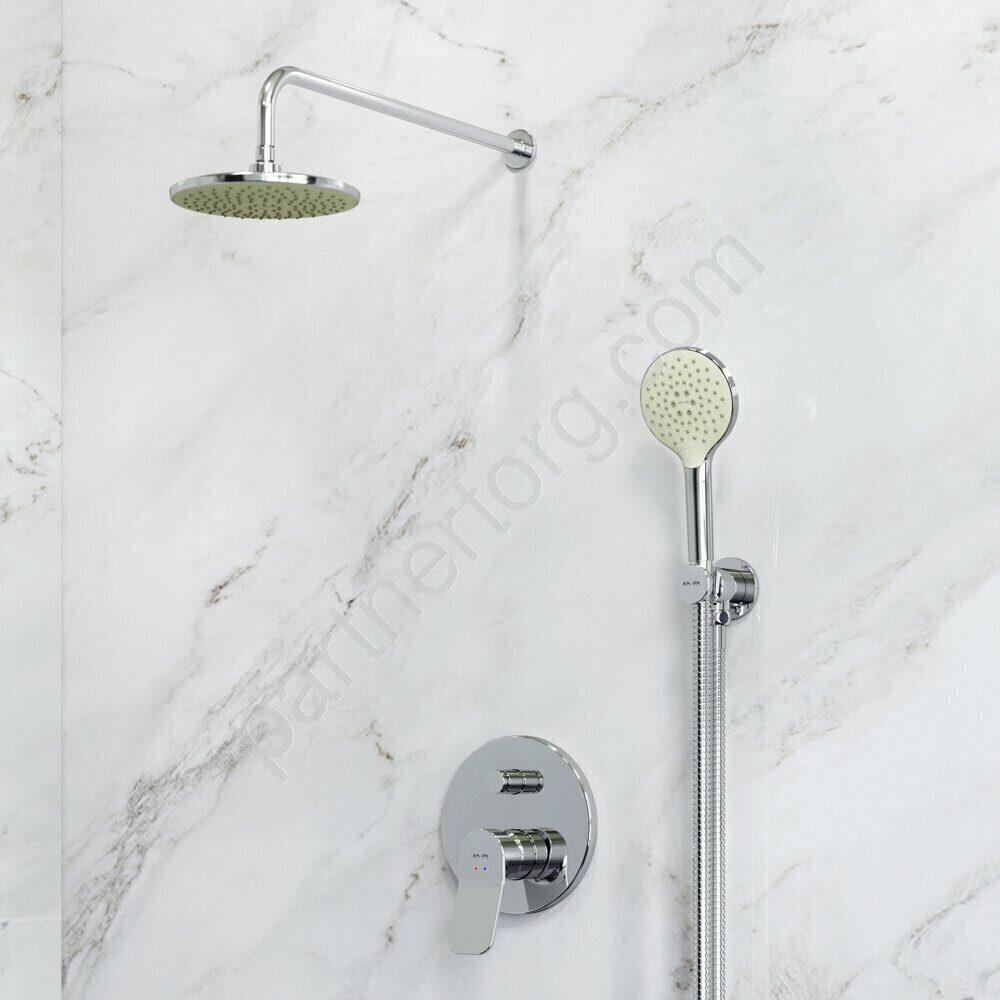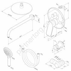 Набор: смеситель для ванны и душа, верхний душ с держателем, душевой набор и шланговое присоединение