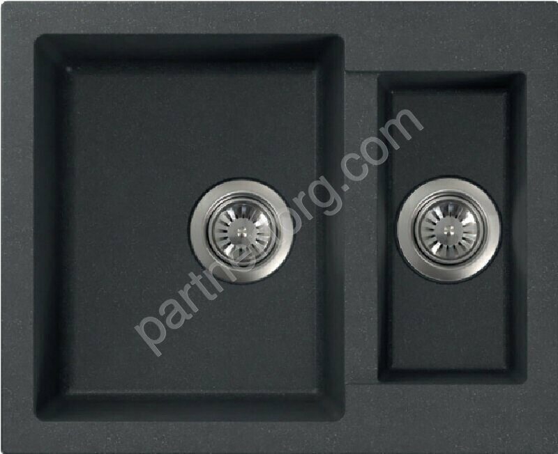 Размер мойки: 60х48,5см. Размеры чаш 33х41,5см и 16х33,5см. Глубина: 18см и 11,5см. Двойной сифон в комплекте. Материал: 80% кварцевый наполнитель и 20% полимерное связующее. Доступные цвета: антрацит, искристый черный, арктик, иней, латте, дюна, искристый бетон, искристый серый