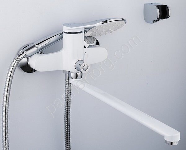 Размер: 40,3х13,6см. Излив 35см, поворотный. Цвет: белый/хром. Материал: латунь.  Тип картриджа: Керамический 35 мм. В комплекте: душевой шланг 150 см, душевая лейка, держатель лейки, комплект отражателей, аэратор