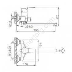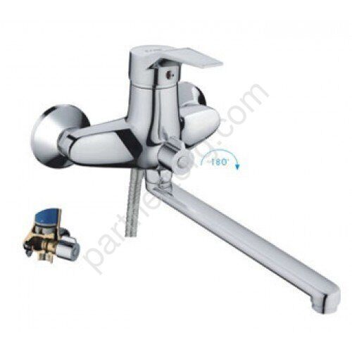 Излив поворотный, настенный. Длина излива: 30 см. Цвет: хром. Материал: силумин. В комплекте: душевой шланг 150 см, душевая лейка, держатель лейки, комплект отражателей, комплект эксцентриков