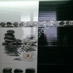 Основная облицовочная плитка коллекции дополняется великолепными декоративными элементами: несколькими видами панно (лотос черный, олеандр черный, тюльпаны, виолетта лиловый), бордюрами, декоративными вставками.
