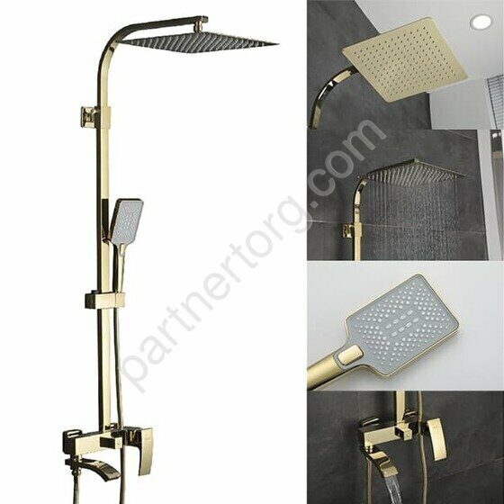Размеры: 35х155см. Цвет: золото. Материал: латунь. Монтаж: на стену. Тип: со смесителем, с изливом. В комплекте: тропический круглый душ 20х20см, Душевая лейка с выдвижным держателем, душевой шланг.