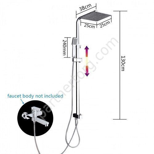 Размеры: 38х130см. Цвет: хром. Материал: латунь. Монтаж: на стену. Тип: без смесителя. В комплекте: Душевая лейка 250х250мм, душевой шланг и шланг для подключения к смесителю