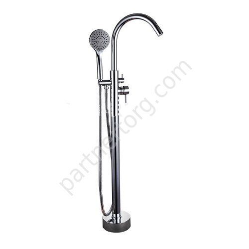 Цвет: хром. Материал: латунь. Излив: 25см, стационарный, высокий. В комплекте Гибкая подводка 1/2, Душевой шланг 150 см, Душевая лейка