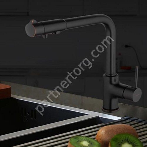 Размеры: 22,5х27,8см. Цвет: черный. Материал: латунь. Управление: однорычажный. Излив: высокий, поворотный, средний. Со встроенным фильтром. С аэратором.