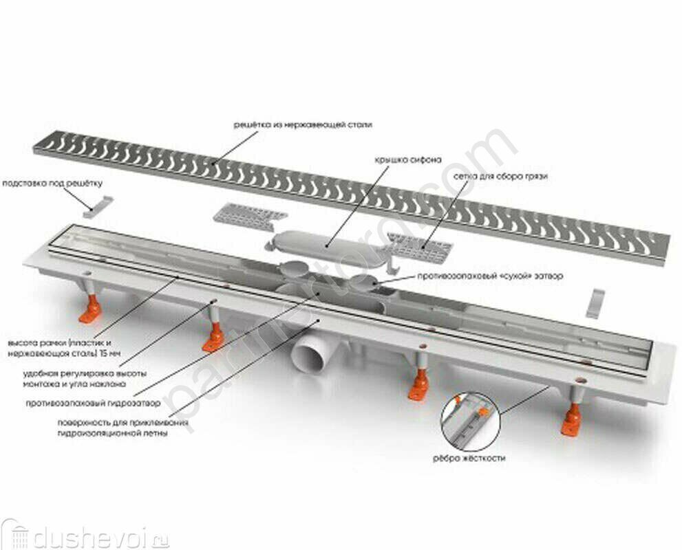 Низкая монтажная высота 50 мм, комбинированный затвор - гидрозавтор + сухой затвор, удобная регулировка высоты монтажа и угла наклона желоба от 65 мм до 87 мм, высота рамки желоба 15 мм, усиление корпуса желоба ребрами жесткости, удобный доступ для чистки сифона