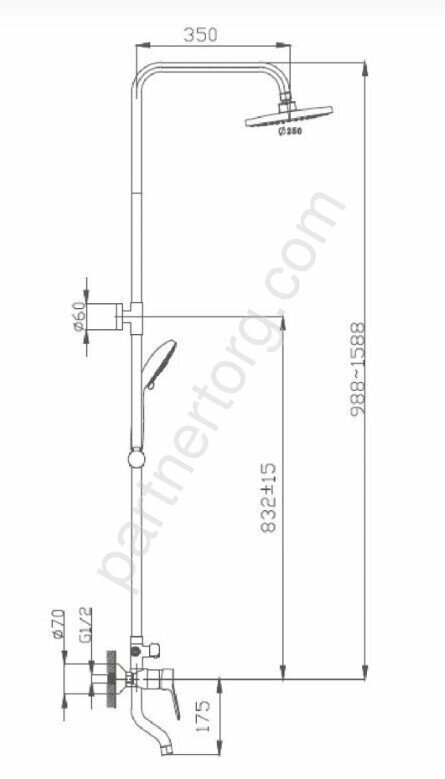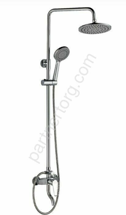 Смеситель: Латунь. Цвет хром. С коротким поворотным изливом. Штанга: Латунь.  Высота регулируемая - 988-1588 мм. Верхний душ: ABS-пластик. Регулируемый. Круглый. Диаметр 250мм. Ручная лейка: 1 режим. Пластик.