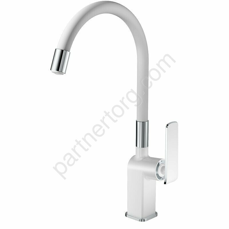 Латунь. Цвет хром/белый. Высота излива 308 мм. Керамический картридж. Гибкий излив.