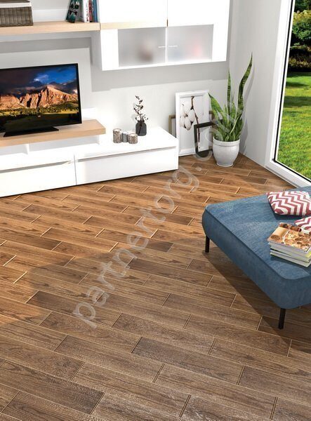 Коричневый керамогранит воспроизводит древесину лиственницы.