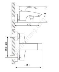 Размер: 17,0х11,4см. Цвет: хром. Материал: латунь. Излив: стационарный, короткий. Картридж керамический 35 мм. Монтаж: на два отверстия, настенные. Комплект: душевой шланг 150 см, Душевая лейка, Держатель лейки, Комплект отражателей, Комплект эксцентриков