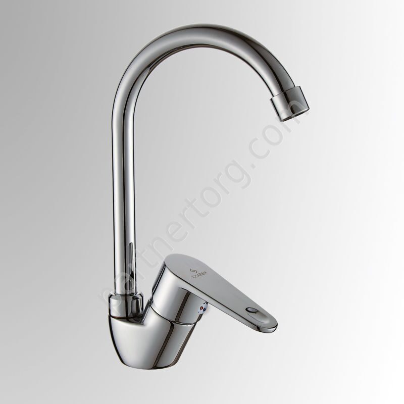 Материал: Латунь. Покрытие: никель-хромовое; Цвет: хром; Излив: высокий, поворотный. Гибкая подводка: Нетоксичный каучук. Угол поворота: 360