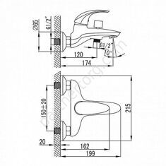 Длина: 18,2 см. Длина излива: 12,6 см. Длина шланга: 150 см. Материал: латунь. Картридж: керамика 30 мм. Количество режимов лейки: 3 режима. Способ монтажа: на стену. Цвет: Хром