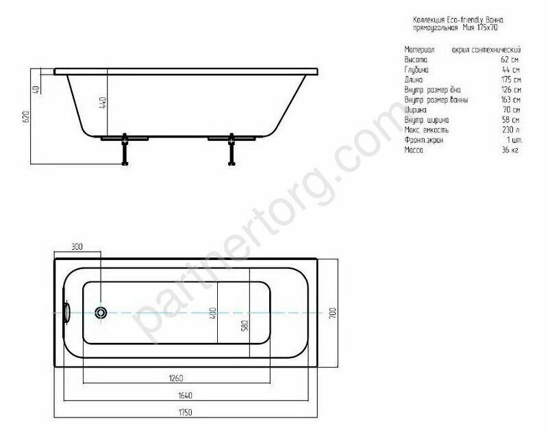 Длина, мм: 1750. Ширина, мм: 700. Высота, мм: 620. Глубина, мм: 440