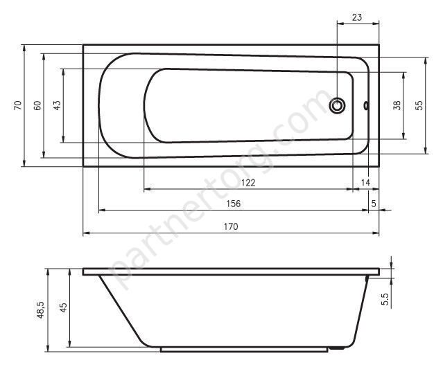 Размер: 170х70 см. Глубина 48,5 см. Объем 150 л. Цвет: белый. 100% акрил.