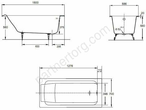 Длина, мм: 1500.  Ширина, мм: 700. Высота, мм: 580. Глубина, мм: 375. Объем, л: 166.