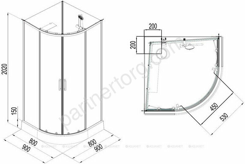 Комплектация: верхний душ, полка, смеситель, держатель душа, душевая лейка (1 режим), сифон