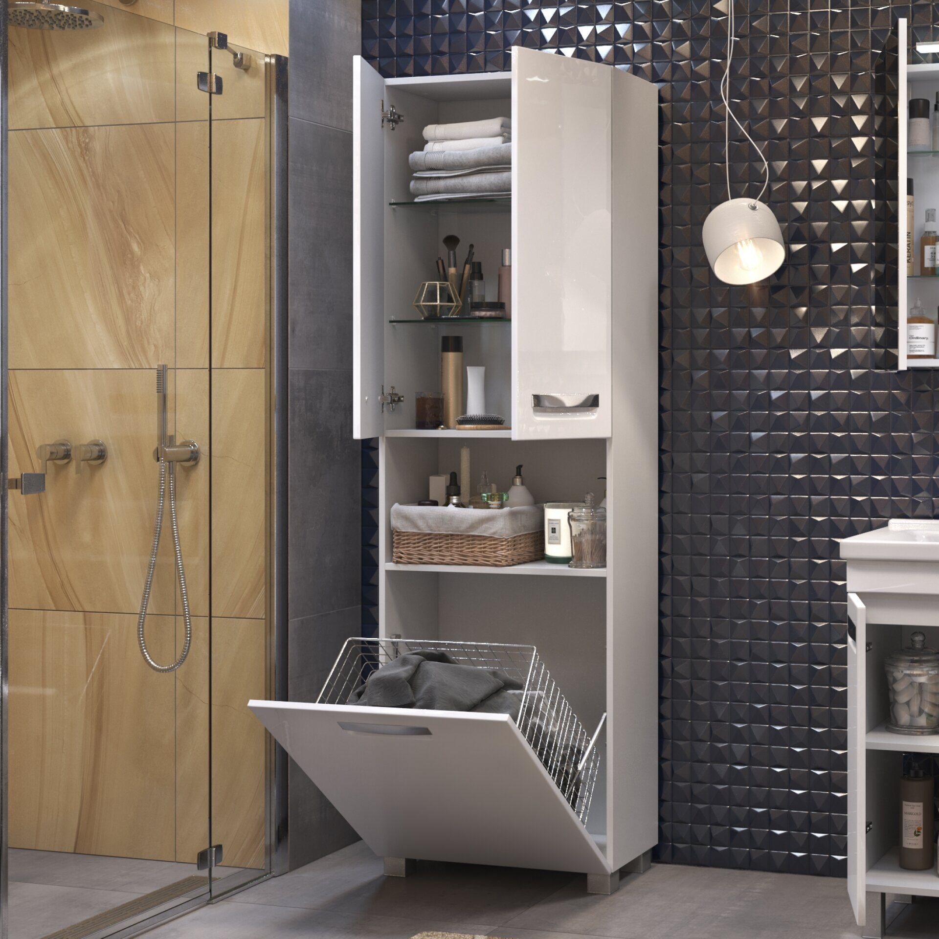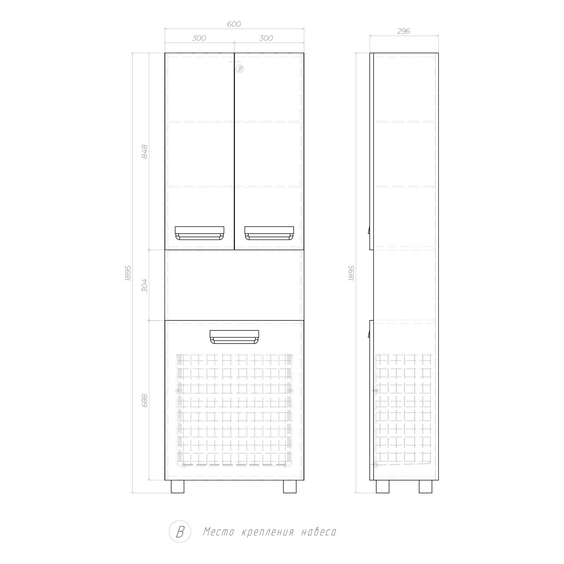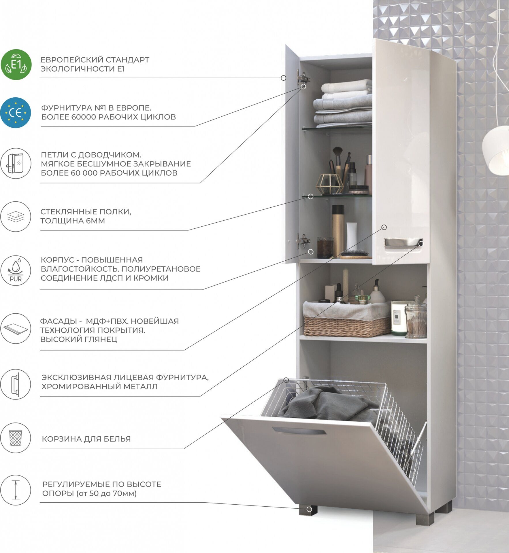 Размер: 60х29,6х188,5 см. Напольный. Цвет: белый. Комплект: 2 дверки (плавное закрывание), 1 ящик (мягкое бесшумное самозакрывание), 1 бельевая корзина, 2 полки ЛДСП, 3 ручки, ножки.