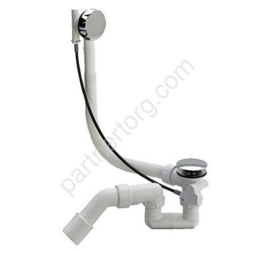 хромированная пробка донного клапана со штоком, гидрозатвор, сливное колено 45°, донный клапан - нержавеющая сталь. Длина троса приводного механизма - 560мм.