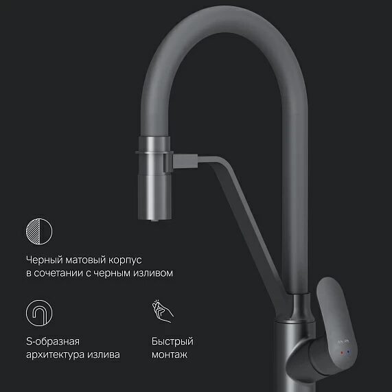 Am.PmСмеситель для кухни высокий, чёрный с черным гибким изливом F8007822 Like AM.PM