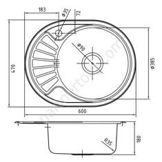 Размер: 600х470 мм, глубина 180 мм. Материал: нержавеющая сталь 304, толщина: 0,8 мм. Антишумовое покрытие Silenon, резиновая накладка против шума. Покрытие: хром блестящий. Чаша справа.