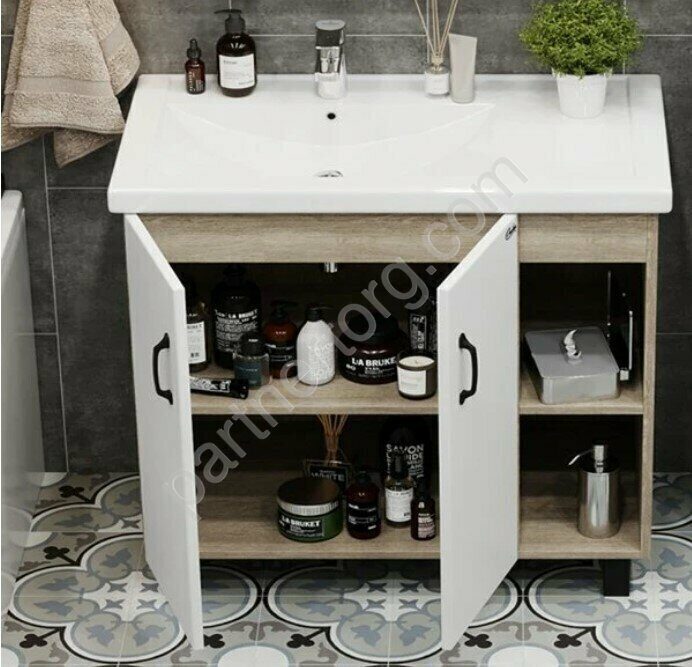 Размер:82,5х71х44см. Корпус: Влагостойкий ЛДСП цвет Дуб Сонома. Фасад: Влагостойкий ЛДСП цвет Белый. Конструкция: 2 дверцы. Фурнитура – Boyard . Ручки матовый хром.