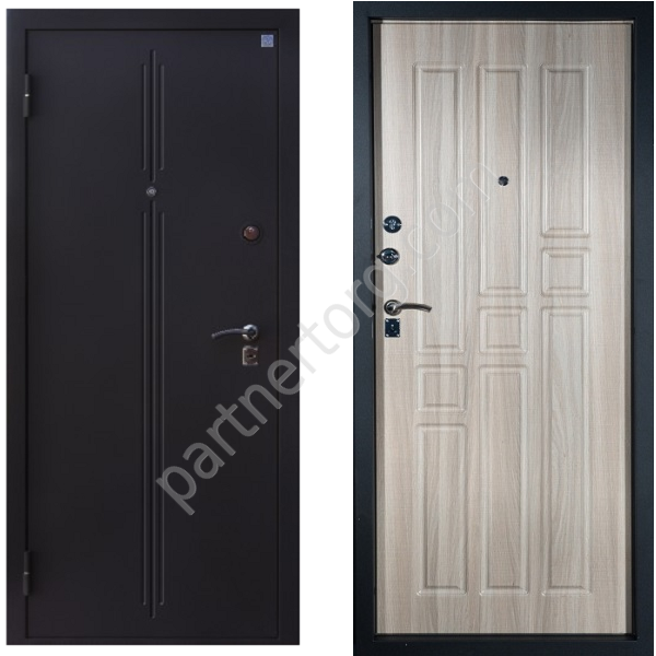 Размеры 880х2050, 960х2050 мм. Сталь: 1,5 мм. Основной замок «Гардиан» 3011. Дополнительный замок «Гардиан» 3201. D-профиль на полотне и коробе по всему периметру. Декоративная МДФ панель16 мм с филенчатым рисунком: цвет Серый холст.