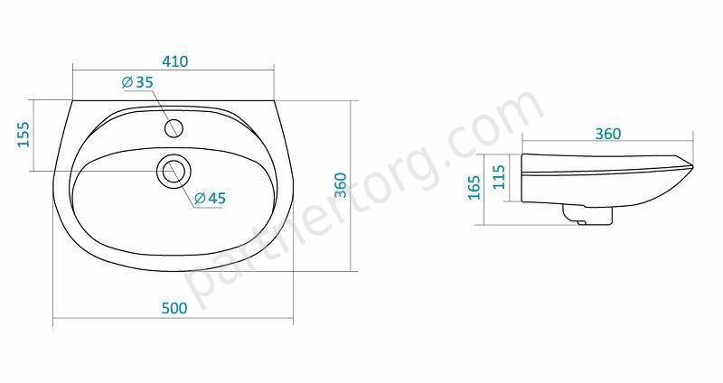 Размер: 50х36х16,5см. Белый. С отверстием для установки смесителя, с переливом, с возможностью установки к стене на пьедестал.