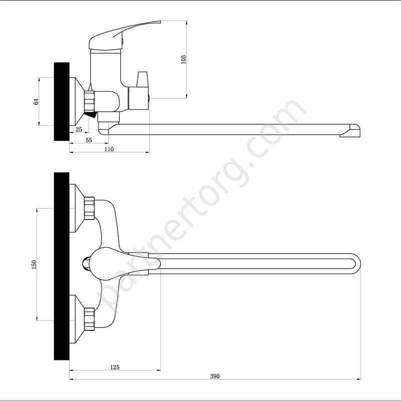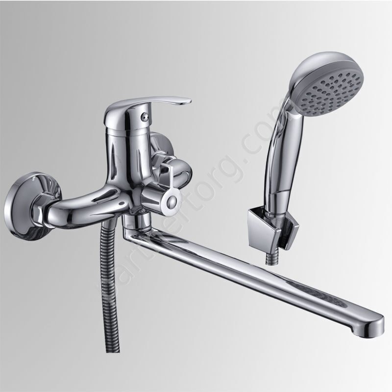 Флажковый. Материал: Латунь. Покрытие: никель-хромовое; Цвет: хром; Излив: стальной, поворотный, 32 см. Комплект: лейка, шланг, крепление для лейки на смесители и настенное, дивертор