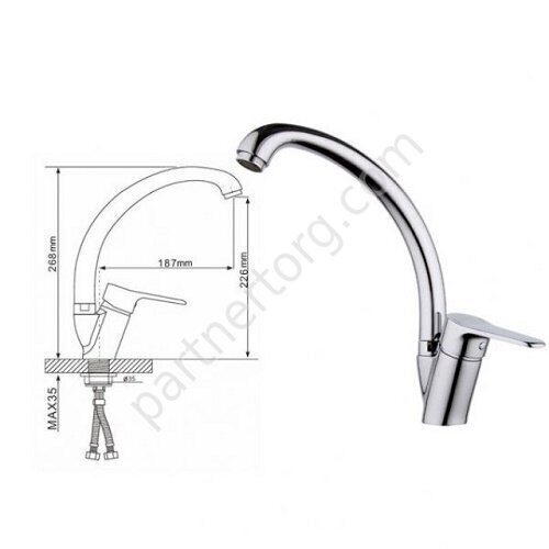 Размер: 18,7х22,6см. Цвет: хром. Материал: латунь. Излив: Поворотный, высокий. Тип картриджа: Керамический 35 мм. С аэратором.
