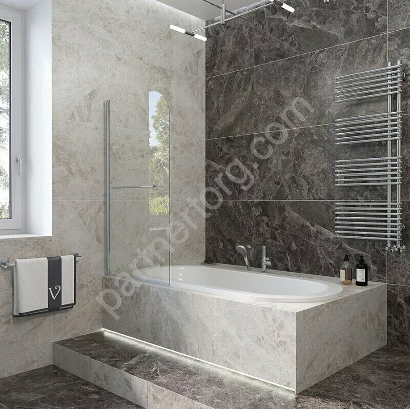 Размеры: 90х150см. Прозрачное стекло 5мм. Профиль: хром, анодированный алюминий. Крепление: на борт ванны. Открывание: маятниковая. С полотенцедержателем.