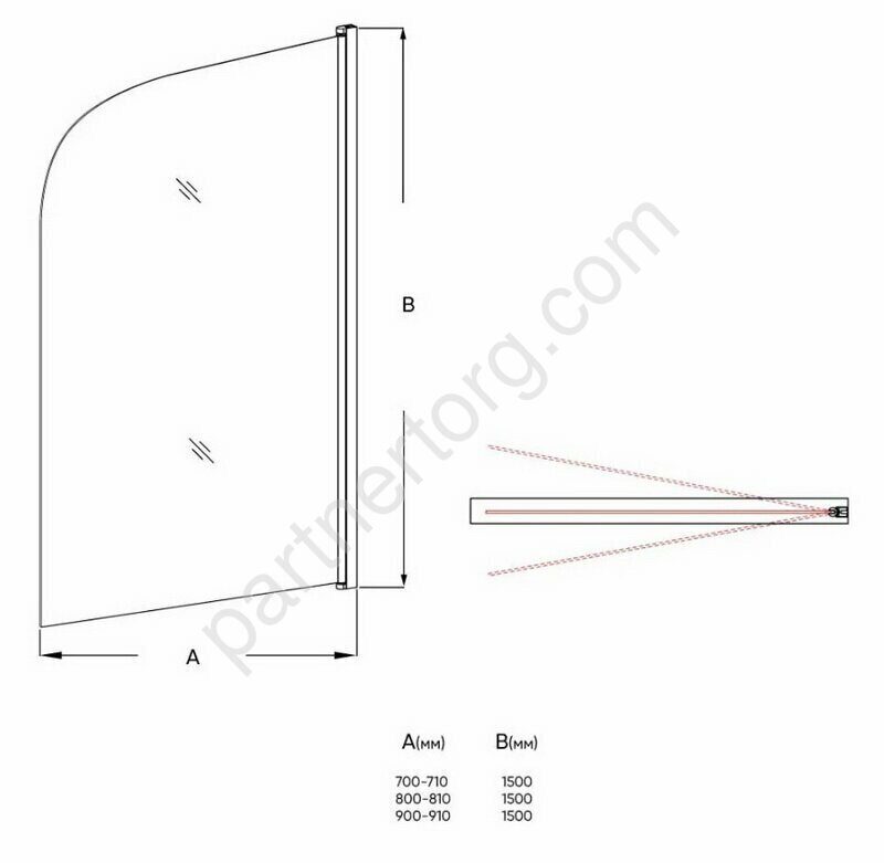 Размеры: 70х150 см. Прозрачное стекло 6мм. Профиль: хром, анодированный алюминий. Крепление: на борт ванны. Открывание: маятниковая