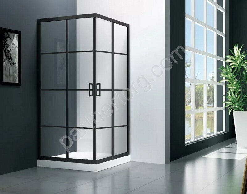 Размеры: 90х90x195 см. Прозрачное стекло 6 мм. Черный матовый алюминиевый профиль. 2 раздвижные двери.