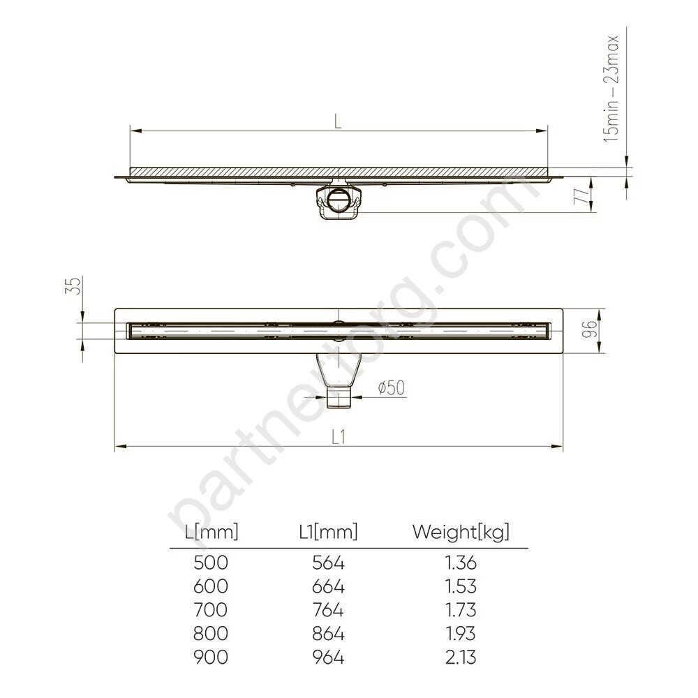 Монтажная длина душевого лотка больше длины решетки на 65 мм (например: решетка 500 мм - монтажная длина лотка 565 мм).