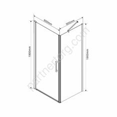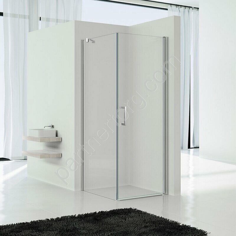 Размеры: 90х90x190 см. Прозрачное стекло 6 мм. Хромированный алюминиевый профиль. 1 распашная дверь.
