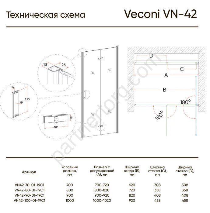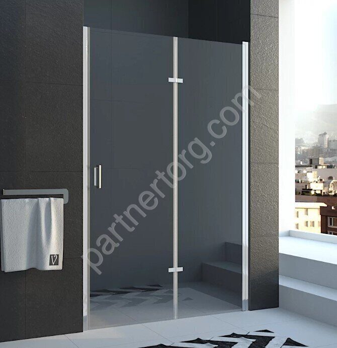 Размеры: 90-92х195см. Прозрачное закаленное стекло 5 мм. Профиль: хром, анодированный алюминий. Складная дверь