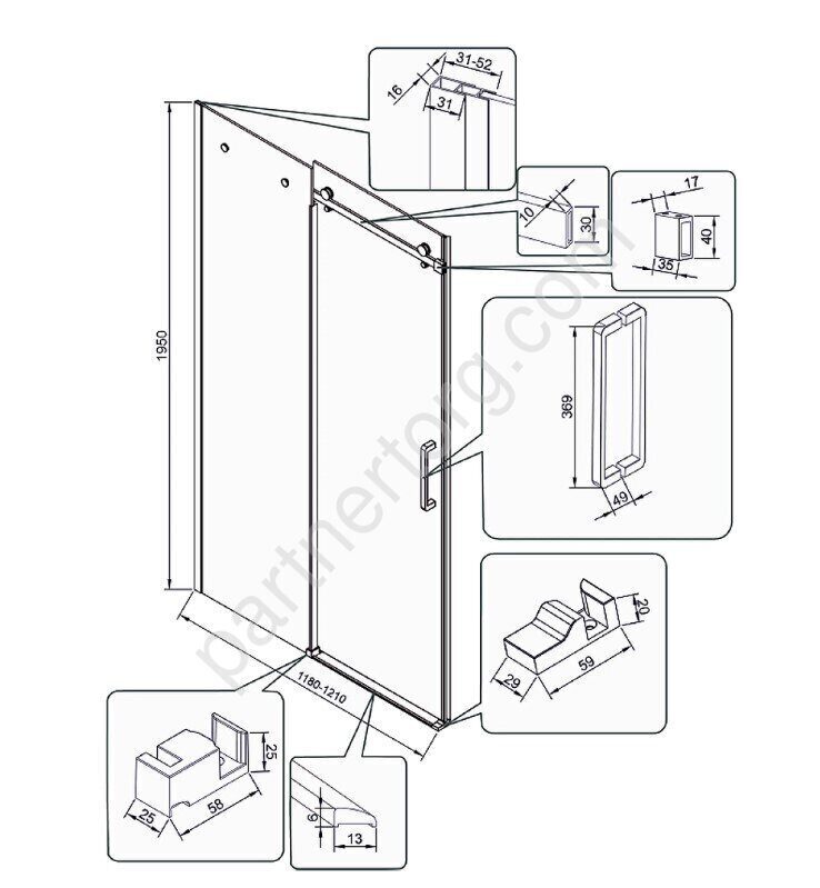 Профиль анодированный алюминий Направляющая рельса из нержавеющей стали Ролики из нержавеющей стали Двусторонняя ручка-скоба из нержавеющей стали . Заглушки