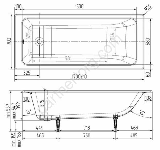 Длина: 1700 мм, ширина: 700 мм, объем: 160 л. Глубина: 392см.