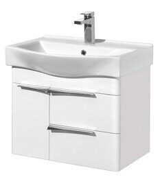 Размер (см): 45,5х61,6х35,7 Цвет: белый глянец. Комплект: Навес - 2 шт., Ручка - 3 шт., Выдвижной ящик - 2 шт., Фасад ящика - 2 шт., Петли с интегрированной системой плавного закрывания - 2 шт., Фасад-створка - 1 шт., Направляющие с интегрированной системой плавного закрывания - 2 шт., Вкладная полка из ВЛДСП - 1 шт.. Раковина Беверли 65.