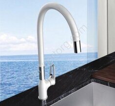 Цвет: белый/хром. На одно отверстие, на гайке. Излив с гибким изливом, высокий, 30 см. Материал: латунь, силиконовые. В комплекте: гибкая подводка 1/2