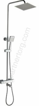 Смеситель: Латунь. Цвет хром/белый. С коротким изливом.   Высота регулируемая - 937-1537 мм. Ручная лейка: 1 режим. Верхний душ 260мм